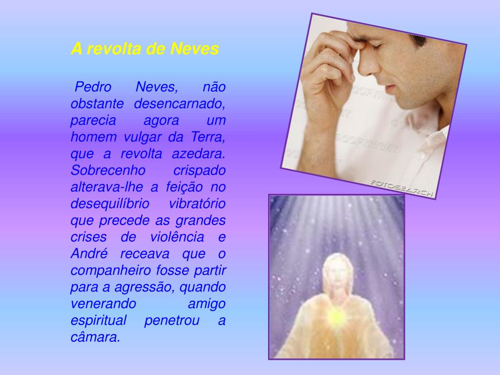 A revolta de Neves Pedro Neves, não obstante desencarnado, parecia agora um homem vulgar da Terra, que a revolta azedara. Sobrecenho crispado alterava-lhe a feição no desequilíbrio vibratório que precede as grandes crises de violência e André receava que o companheiro fosse partir para a agressão, quando venerando amigo espiritual penetrou a câmara.