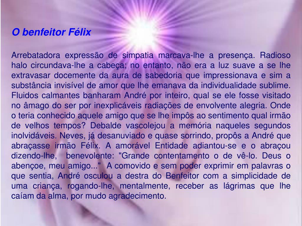 O benfeitor Félix Arrebatadora expressão de simpatia marcava-lhe a presença. Radioso halo circundava-lhe a cabeça; no entanto, não era a luz suave a se lhe extravasar docemente da aura de sabedoria que impressionava e sim a substância invisível de amor que lhe emanava da individualidade sublime. Fluidos calmantes banharam André por inteiro, qual se ele fosse visitado no âmago do ser por inexplicáveis radiações de envolvente alegria. Onde o teria conhecido aquele amigo que se lhe impôs ao sentimento qual irmão de velhos tempos? Debalde vascolejou a memória naqueles segundos inolvidáveis. Neves, já desanuviado e quase sorrindo, propôs a André que abraçasse irmão Félix. A amorável Entidade adiantou-se e o abraçou dizendo-lhe, benevolente: "Grande contentamento o de vê-lo. Deus o abençoe, meu amigo..." A comovido e sem poder exprimir em palavras o que sentia, André osculou a destra do Benfeitor com a simplicidade de uma criança, rogando-lhe, mentalmente, receber as lágrimas que lhe caíam da alma, por mudo agradecimento.
