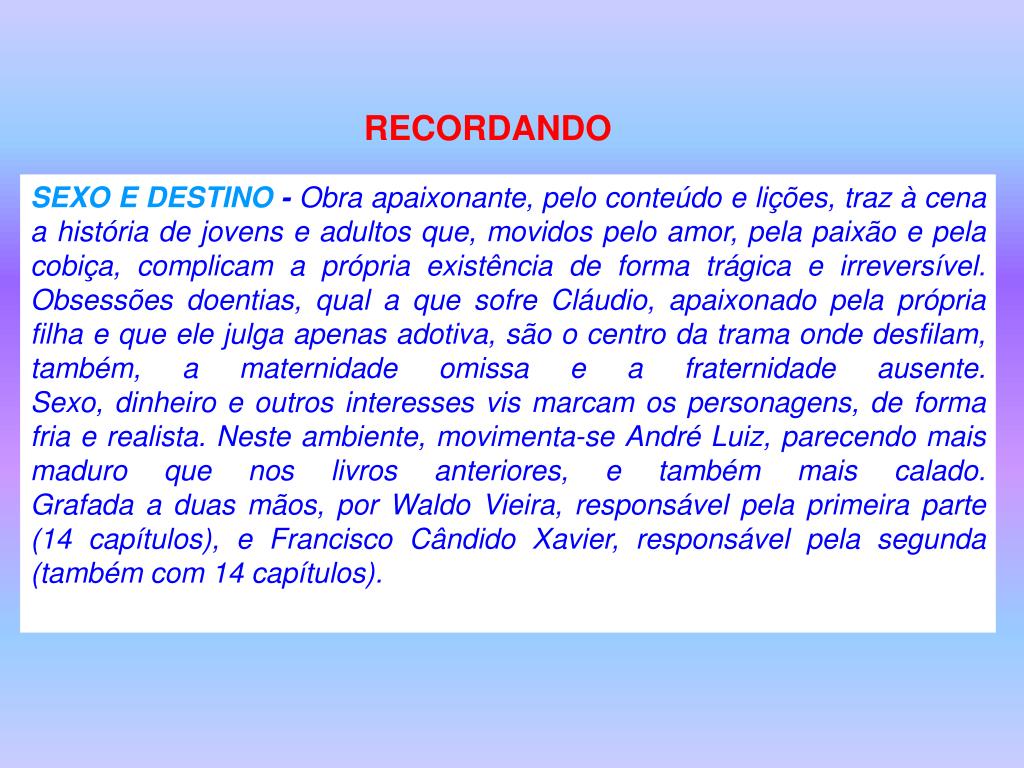 RECORDANDO SEXO E DESTINO - Obra apaixonante, pelo conteúdo e lições, traz à cena a história de jovens e adultos que, movidos pelo amor, pela paixão e pela cobiça, complicam a própria existência de forma trágica e irreversível. Obsessões doentias, qual a que sofre Cláudio, apaixonado pela própria filha e que ele julga apenas adotiva, são o centro da trama onde desfilam, também, a maternidade omissa e a fraternidade ausente.Sexo, dinheiro e outros interesses vis marcam os personagens, de forma fria e realista. Neste ambiente, movimenta-se André Luiz, parecendo mais maduro que nos livros anteriores, e também mais calado.Grafada a duas mãos, por Waldo Vieira, responsável pela primeira parte (14 capítulos), e Francisco Cândido Xavier, responsável pela segunda (também com 14 capítulos).