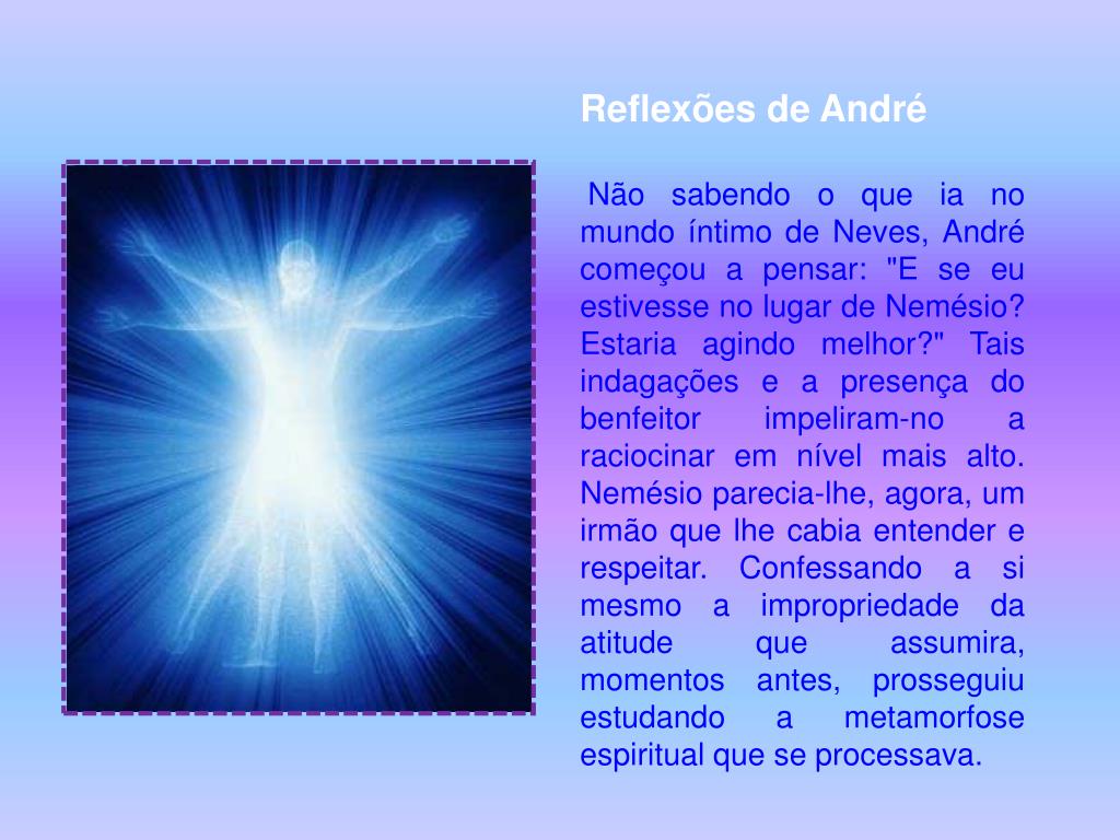 Reflexões de André Não sabendo o que ia no mundo íntimo de Neves, André começou a pensar: "E se eu estivesse no lugar de Nemésio? Estaria agindo melhor?" Tais indagações e a presença do benfeitor impeliram-no a raciocinar em nível mais alto. Nemésio parecia-lhe, agora, um irmão que lhe cabia entender e respeitar. Confessando a si mesmo a impropriedade da atitude que assumira, momentos antes, prosseguiu estudando a metamorfose espiritual que se processava.
