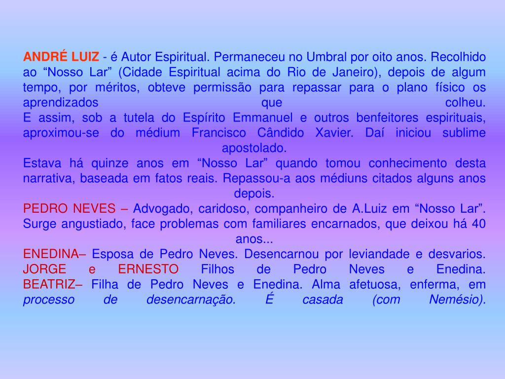 ANDRÉ LUIZ- é Autor Espiritual. Permaneceu no Umbral por oito anos. Recolhido ao “Nosso Lar” (Cidade Espiritual acima do Rio de Janeiro), depois de algum tempo, por méritos, obteve permissão para repassar para o plano físico os aprendizados que colheu.E assim, sob a tutela do Espírito Emmanuel e outros benfeitores espirituais, aproximou-se do médium Francisco Cândido Xavier. Daí iniciou sublime apostolado.Estava há quinze anos em “Nosso Lar” quando tomou conhecimento desta narrativa, baseada em fatos reais. Repassou-a aos médiuns citados alguns anos depois.PEDRO NEVES – Advogado, caridoso, companheiro de A.Luiz em “Nosso Lar”. Surge angustiado, face problemas com familiares encarnados, que deixou há 40 anos...ENEDINA– Esposa de Pedro Neves. Desencarnou por leviandade e desvarios.JORGE e ERNESTO Filhos de Pedro Neves e Enedina.BEATRIZ– Filha de Pedro Neves e Enedina. Alma afetuosa, enferma, em processo de desencarnação. É casada (com Nemésio).