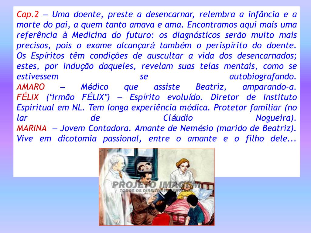 Cap.2– Uma doente, preste a desencarnar, relembra a infância e a morte do pai, a quem tanto amava e ama. Encontramos aqui mais uma referência à Medicina do futuro: os diagnósticos serão muito mais precisos, pois o exame alcançará também o perispírito do doente. Os Espíritos têm condições de auscultar a vida dos desencarnados; estes, por indução daqueles, revelam suas telas mentais, como se estivessem se autobiografando.AMARO– Médico que assiste Beatriz, amparando-a.FÉLIX (“Irmão FÉLIX”) – Espírito evoluído. Diretor de Instituto Espiritual em NL. Tem longa experiência médica. Protetor familiar (no lar de Cláudio Nogueira).MARINA – Jovem Contadora. Amante de Nemésio (marido de Beatriz). Vive em dicotomia passional, entre o amante e o filho dele...