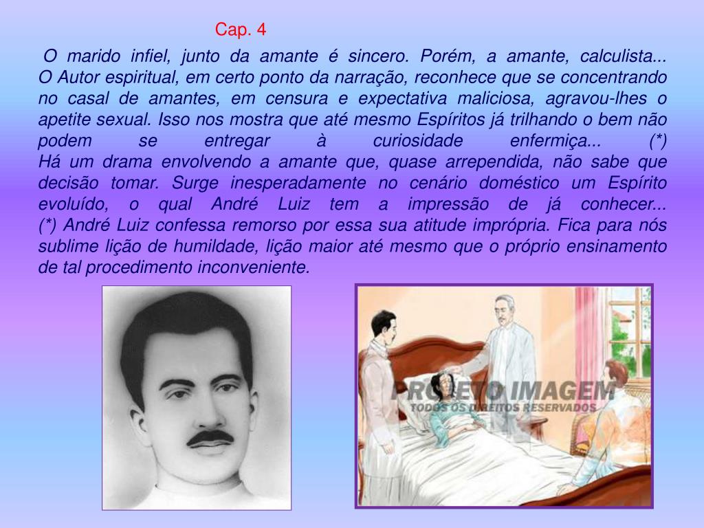 Cap. 4 O marido infiel, junto da amante é sincero. Porém, a amante, calculista...O Autor espiritual, em certo ponto da narração, reconhece que se concentrando no casal de amantes, em censura e expectativa maliciosa, agravou-lhes o apetite sexual. Isso nos mostra que até mesmo Espíritos já trilhando o bem não podem se entregar à curiosidade enfermiça... (*)Há um drama envolvendo a amante que, quase arrependida, não sabe que decisão tomar. Surge inesperadamente no cenário doméstico um Espírito evoluído, o qual André Luiz tem a impressão de já conhecer...(*) André Luiz confessa remorso por essa sua atitude imprópria. Fica para nós sublime lição de humildade, lição maior até mesmo que o próprio ensinamento de tal procedimento inconveniente.