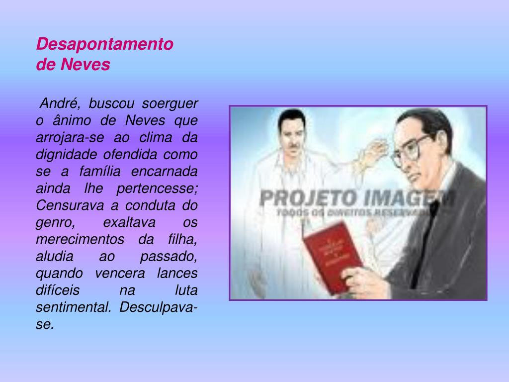 Desapontamento de Neves André, buscou soerguer o ânimo de Neves que arrojara-se ao clima da dignidade ofendida como se a família encarnada ainda lhe pertencesse; Censurava a conduta do genro, exaltava os merecimentos da filha, aludia ao passado, quando vencera lances difíceis na luta sentimental. Desculpava-se.