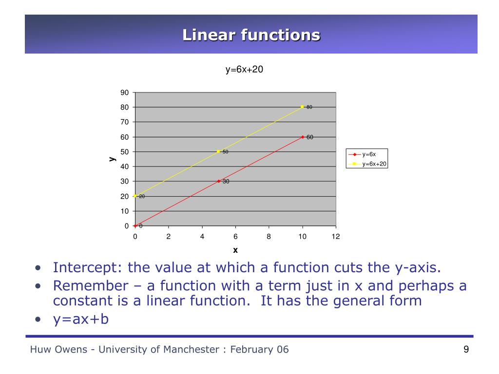 Linear functions • Intercept: the value at which a function cuts the y-axis. • Remember – a function with a term just in x and perhaps a constant is a linear function. It has the general form • y=ax+b