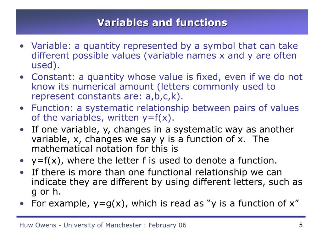 Variables and functions • Variable: a quantity represented by a symbol that can take different possible values (variable names x and y are often used). • Constant: a quantity whose value is fixed, even if we do not know its numerical amount (letters commonly used to represent constants are: a,b,c,k). • Function: a systematic relationship between pairs of values of the variables, written y=f(x). • If one variable, y, changes in a systematic way as another variable, x, changes we say y is a function of x. The mathematical notation for this is • y=f(x), where the letter f is used to denote a function. • If there is more than one functional relationship we can indicate they are different by using different letters, such as g or h. • For example, y=g(x), which is read as “y is a function of x”