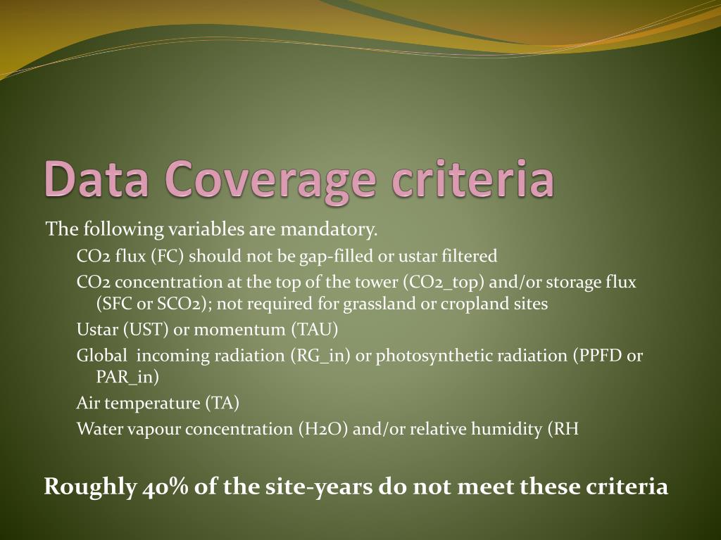 Data Coverage criteria The following variables are mandatory. CO2 flux (FC) should not be gap-filled or ustar filtered CO2 concentration at the top of the tower (CO2_top) and/or storage flux (SFC or SCO2); not required for grassland or cropland sites Ustar (UST) or momentum (TAU) Global incoming radiation (RG_in) or photosynthetic radiation (PPFD or PAR_in) Air temperature (TA) Water vapour concentration (H2O) and/or relative humidity (RH • Roughly 40% of the site-years do not meet these criteria