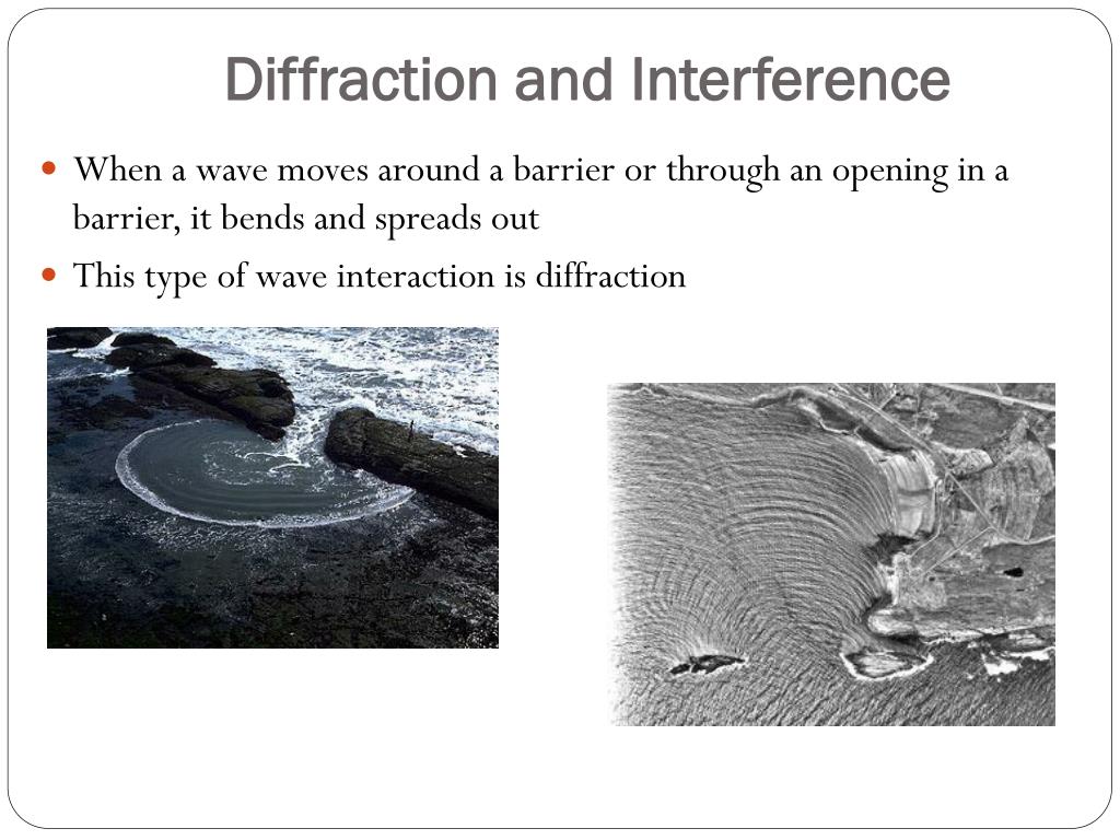Diffraction and Interference • When a wave moves around a barrier or through an opening in a barrier, it bends and spreads out • This type of wave interaction is diffraction