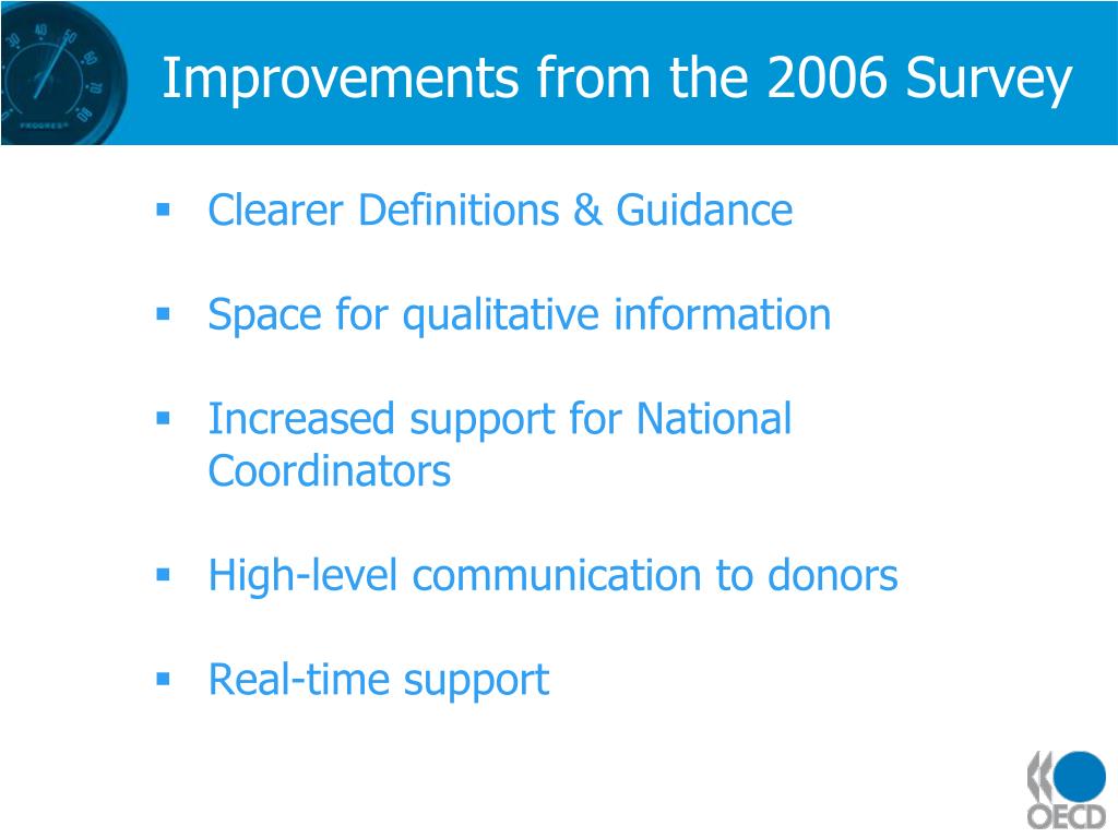 Improvements from the 2006 Survey • Clearer Definitions & Guidance • Space for qualitative information • Increased support for National Coordinators • High-level communication to donors • Real-time support