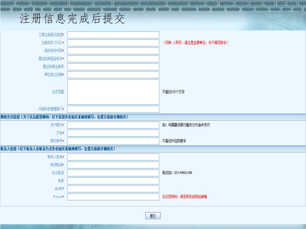 管理服务中心或邮寄至:重庆市渝北区新溉大道2号1楼项目管理服务中心401147,也可传真至:67512869。经中心审核通过后,单位账户被激活,只有单位账户注册并被激活后,项目负责人账户才能注册。