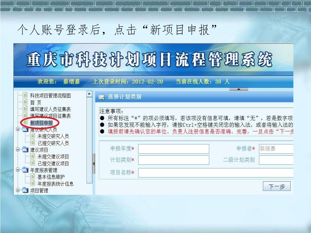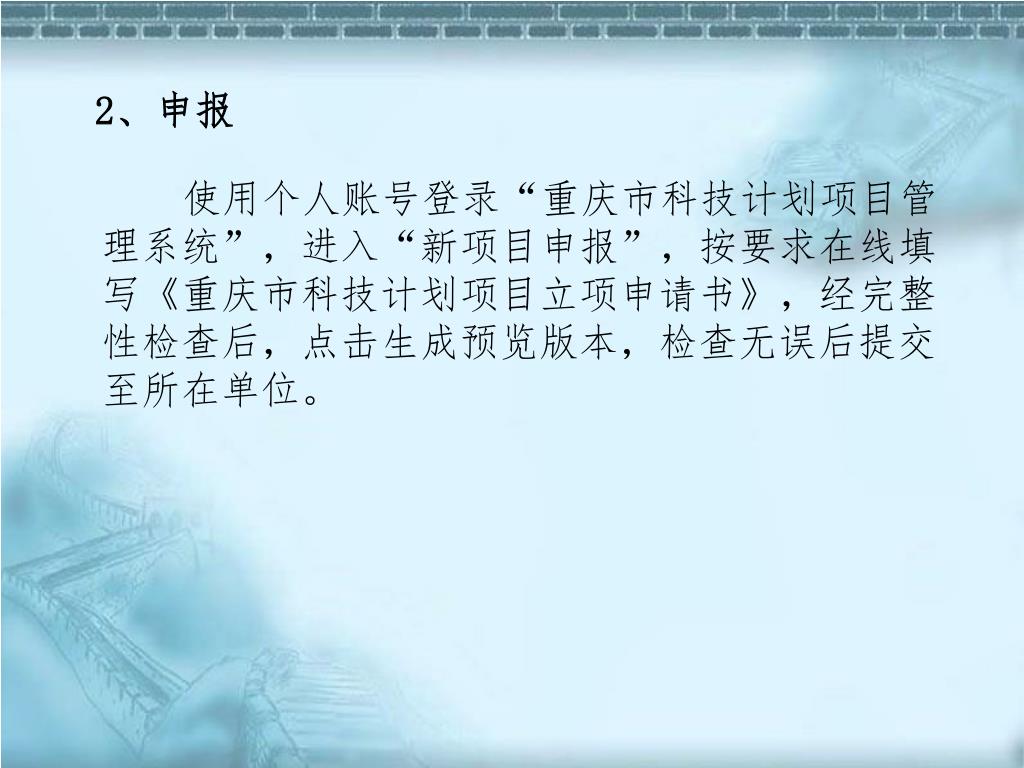 使用个人账号登录“重庆市科技计划项目管理系统”,进入“新项目申报”,按要求在线填写《重庆市科技计划项目立项申请书》,经完整性检查后,点击生成预览版本,检查无误后提交至所在单位。使用个人账号登录“重庆市科技计划项目管理系统”,进入“新项目申报”,按要求在线填写《重庆市科技计划项目立项申请书》,经完整性检查后,点击生成预览版本,检查无误后提交至所在单位。 2、申报