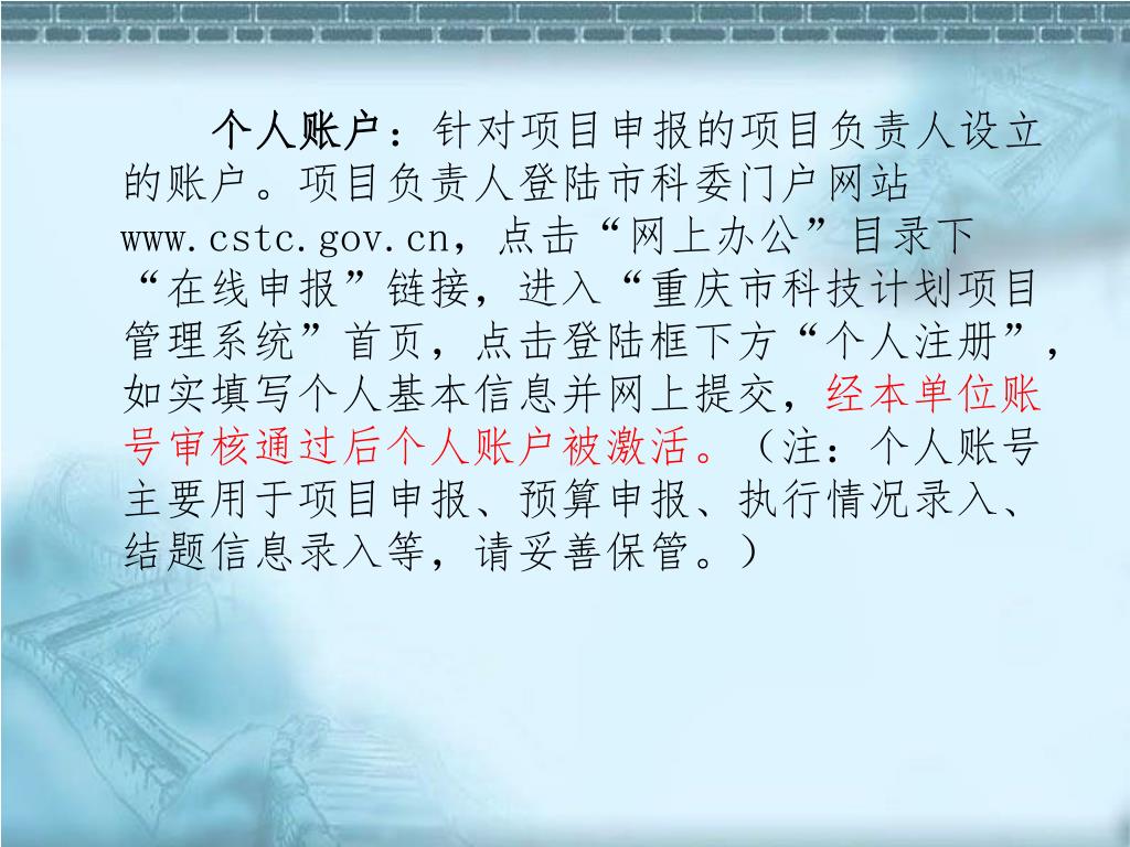 个人账户:针对项目申报的项目负责人设立的账户。项目负责人登陆市科委门户网站www.cstc.gov.cn,点击“网上办公”目录下“在线申报”链接,进入“重庆市科技计划项目管理系统”首页,点击登陆框下方“个人注册”,如实填写个人基本信息并网上提交,经本单位账号审核通过后个人账户被激活。(注:个人账号主要用于项目申报、预算申报、执行情况录入、结题信息录入等,请妥善保管。)个人账户:针对项目申报的项目负责人设立的账户。项目负责人登陆市科委门户网站www.cstc.gov.cn,点击“网上办公”目录下“在线申报”链接,进入“重庆市科技计划项目管理系统”首页,点击登陆框下方“个人注册”,如实填写个人基本信息并网上提交,经本单位账号审核通过后个人账户被激活。(注:个人账号主要用于项目申报、预算申报、执行情况录入、结题信息录入等,请妥善保管。)