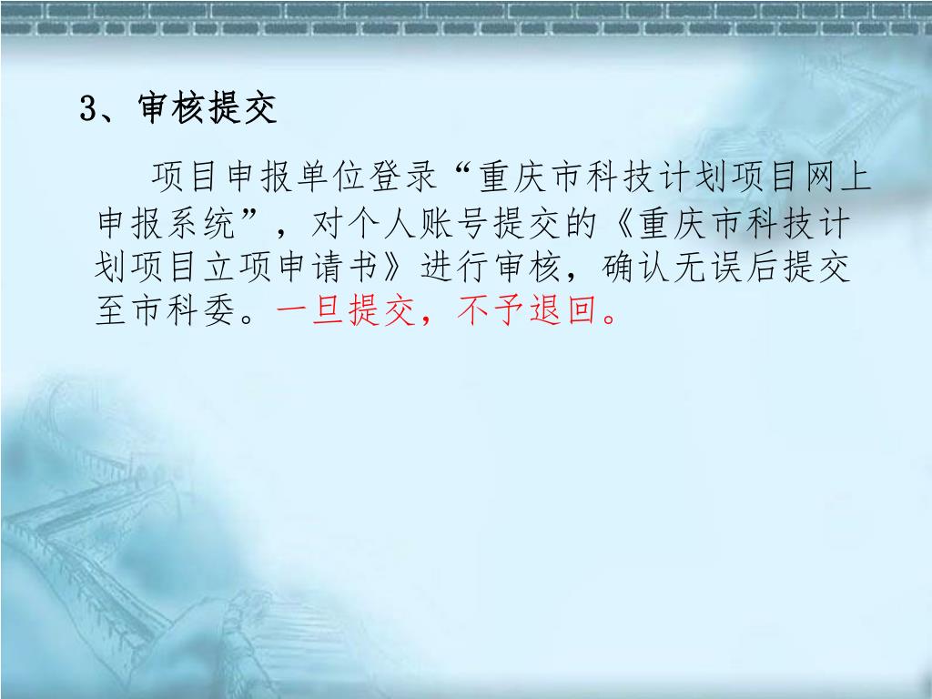 项目申报单位登录“重庆市科技计划项目网上申报系统”,对个人账号提交的《重庆市科技计划项目立项申请书》进行审核,确认无误后提交至市科委。一旦提交,不予退回。项目申报单位登录“重庆市科技计划项目网上申报系统”,对个人账号提交的《重庆市科技计划项目立项申请书》进行审核,确认无误后提交至市科委。一旦提交,不予退回。 3、审核提交