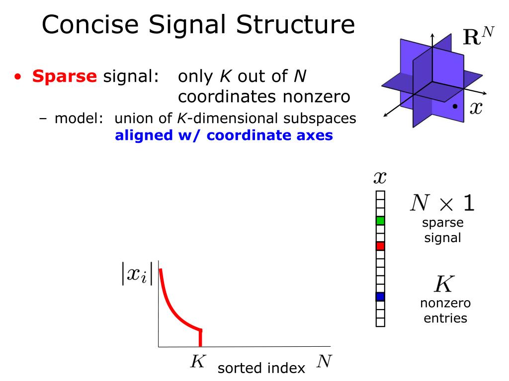 Concise Signal Structure • Sparse signal: only K out of N coordinates nonzero • model: union of K-dimensional subspacesaligned w/ coordinate axes sparsesignal nonzeroentries sorted index