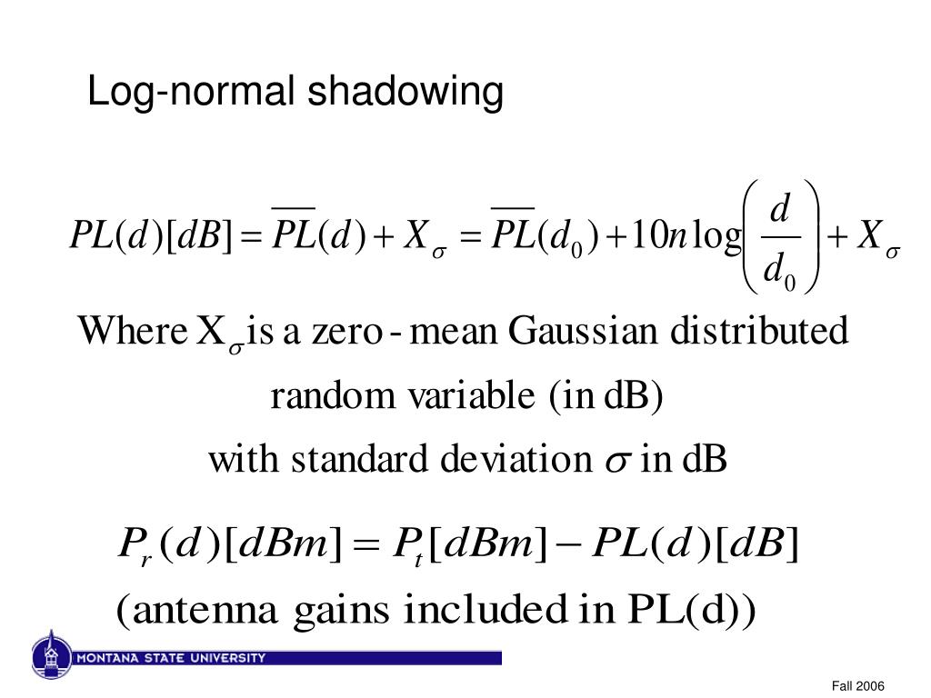 Log-normal (Gaussian) shadowing • Loss along two different paths with same d can vary greatly • Measured signals with same d can deviate from average given by path loss equation • Measurements show that is random and distributed log-normally (normal in dB) about the mean,