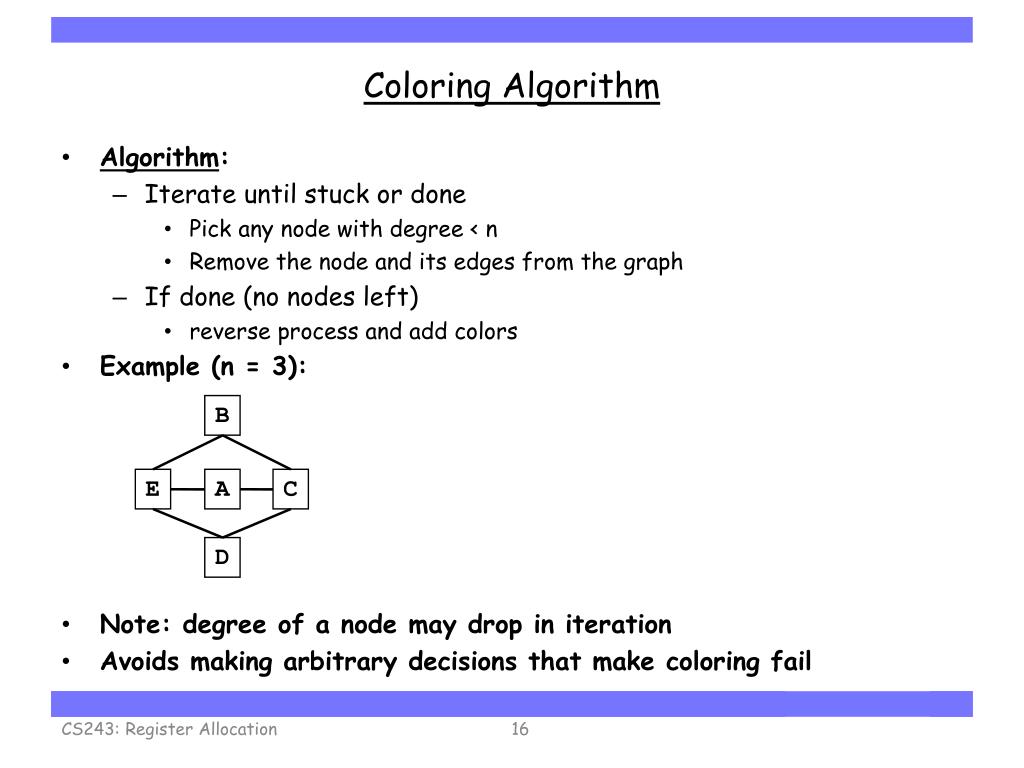 Step 2. Coloring • Reminder: coloring for n > 2 is NP-complete • Observations: • a node with degree < n • can always color it successfully, given its neighbors’ colors • a node with degree = n • a node with degree > n CS243: Register Allocation