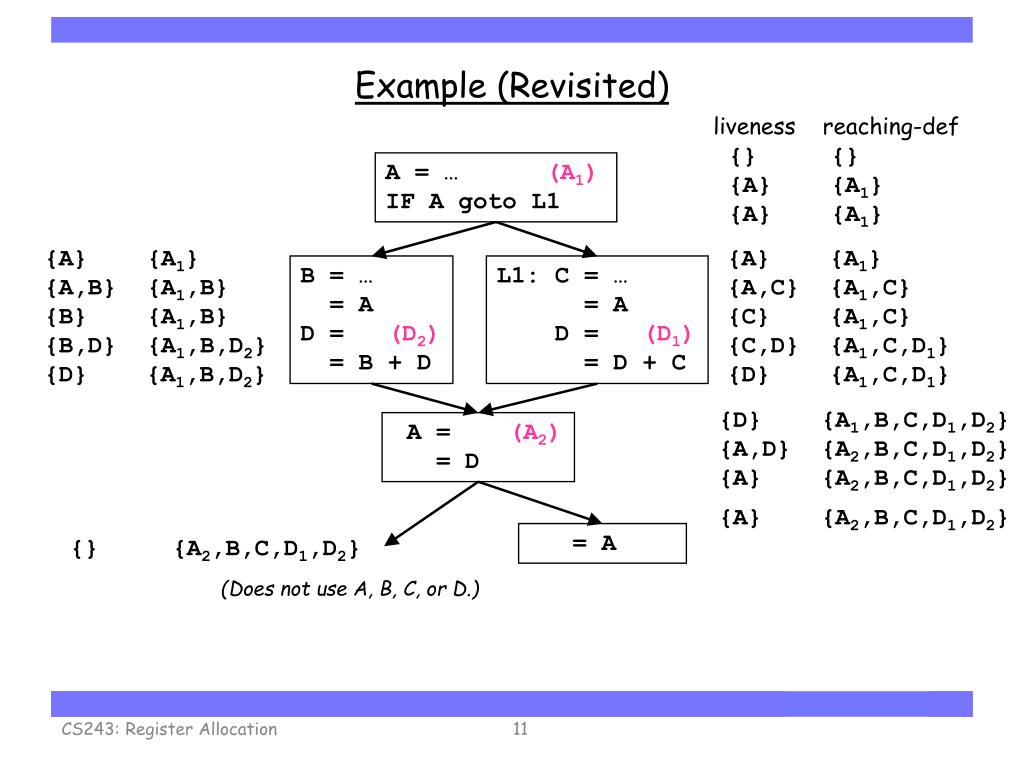 Example A = … IF A goto L1 B = … = A D = = B + D L1: C = … = A D = = C + D CS243: Register Allocation