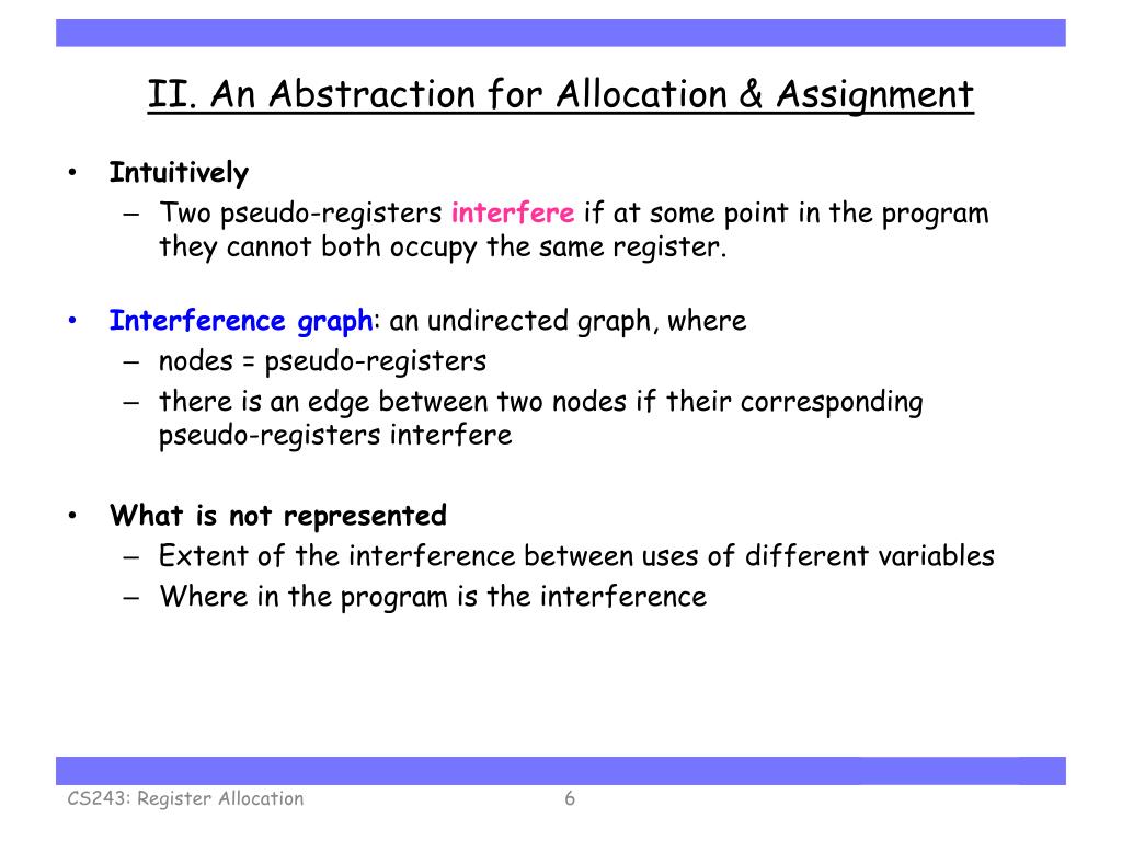 II. An Abstraction for Allocation & Assignment • Intuitively • Two pseudo-registers interfere if at some point in the program they cannot both occupy the same register. • Interference graph: an undirected graph, where • nodes = pseudo-registers • there is an edge between two nodes if their corresponding pseudo-registers interfere • What is not represented • Extent of the interference between uses of different variables • Where in the program is the interference CS243: Register Allocation
