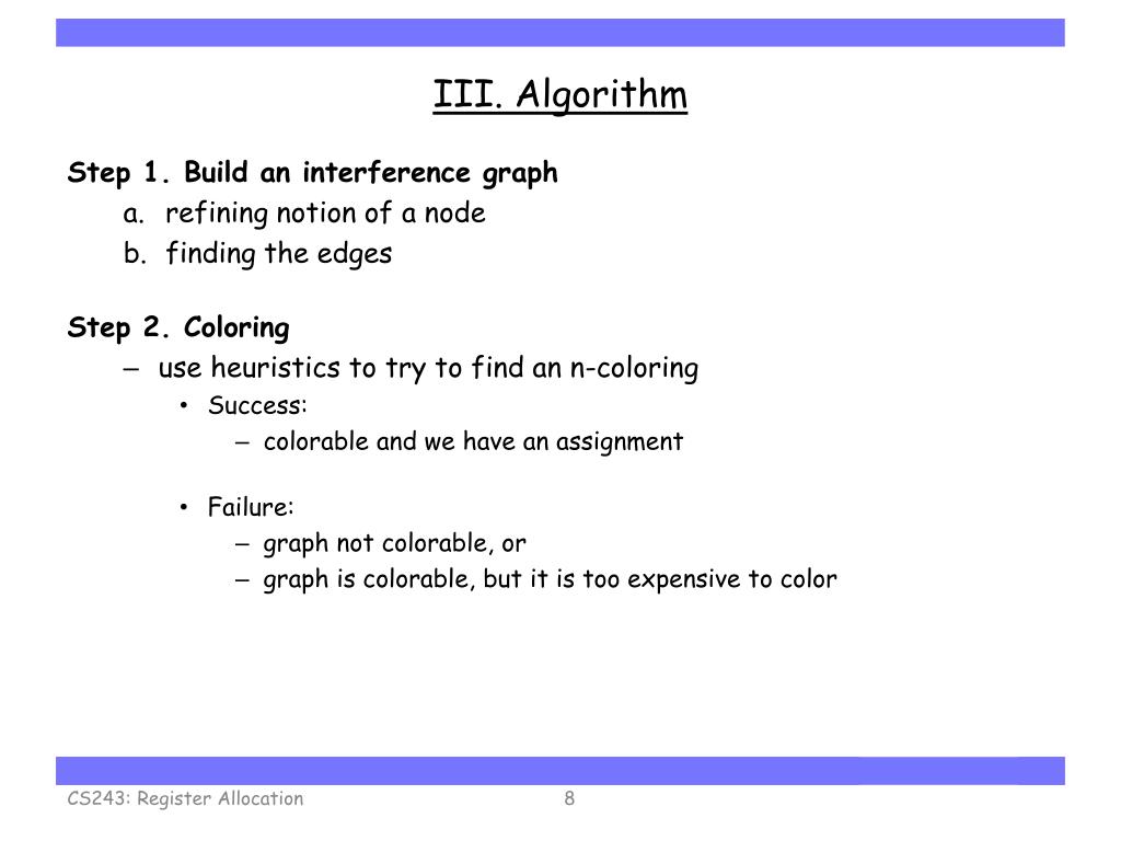 III. Algorithm Step 1. Build an interference graph • refining notion of a node • finding the edges Step 2. Coloring • use heuristics to try to find an n-coloring • Success: • colorable and we have an assignment • Failure: • graph not colorable, or • graph is colorable, but it is too expensive to color CS243: Register Allocation