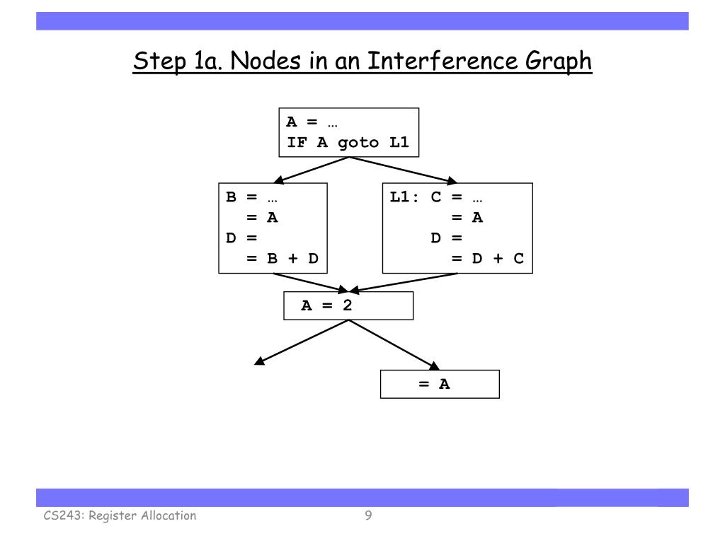 Step 1a. Nodes in an Interference Graph A = … IF A goto L1 B = … = A D = = B + D L1: C = … = A D = = D + C A = 2 = A CS243: Register Allocation