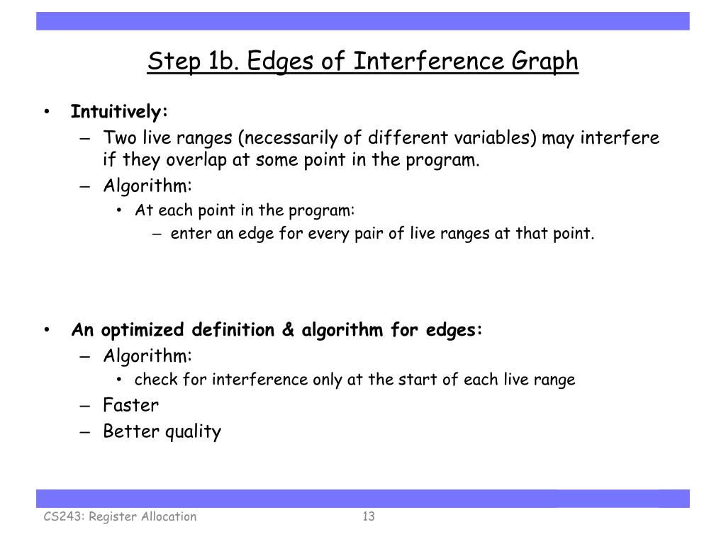 Step 1b. Edges of Interference Graph • Intuitively: • Two live ranges (necessarily of different variables) may interfereif they overlap at some point in the program. • Algorithm: • At each point in the program: • enter an edge for every pair of live ranges at that point. • An optimized definition & algorithm for edges: • Algorithm: • check for interference only at the start of each live range • Faster • Better quality CS243: Register Allocation