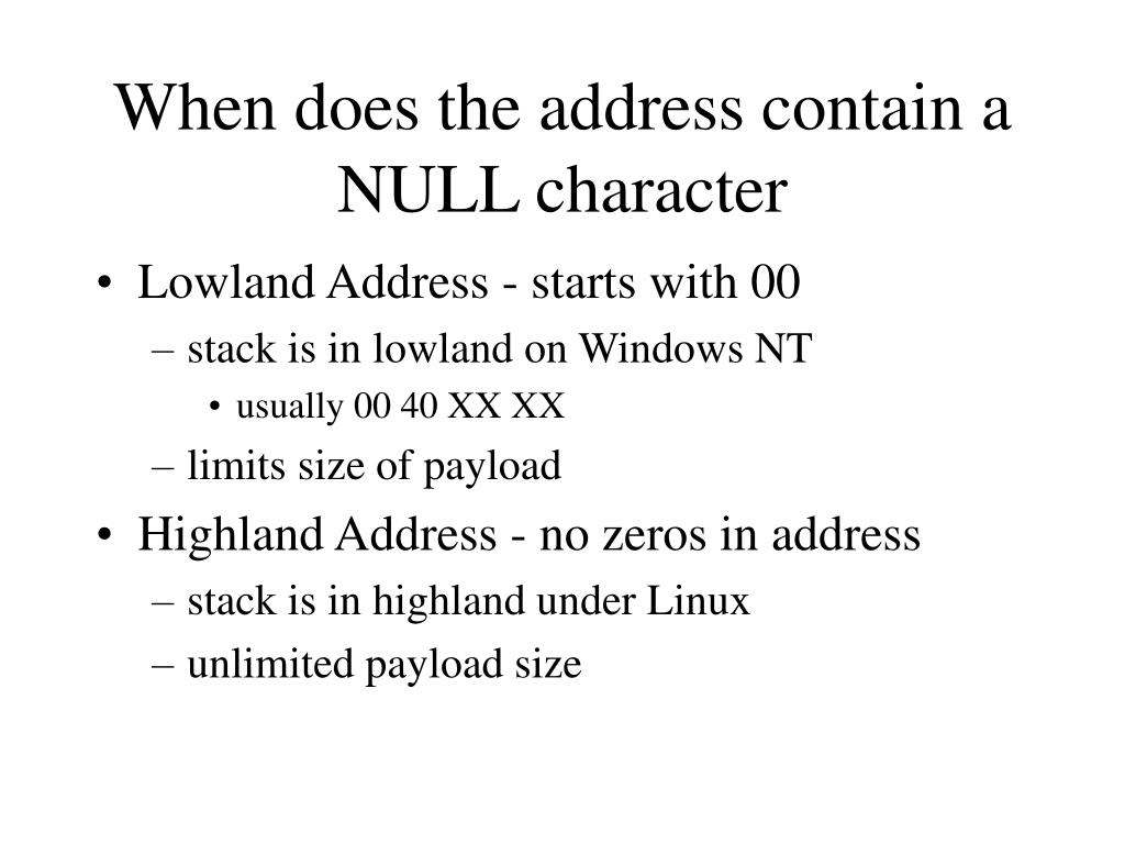 When does the address contain a NULL character • Lowland Address - starts with 00 • stack is in lowland on Windows NT • usually 00 40 XX XX • limits size of payload • Highland Address - no zeros in address • stack is in highland under Linux • unlimited payload size