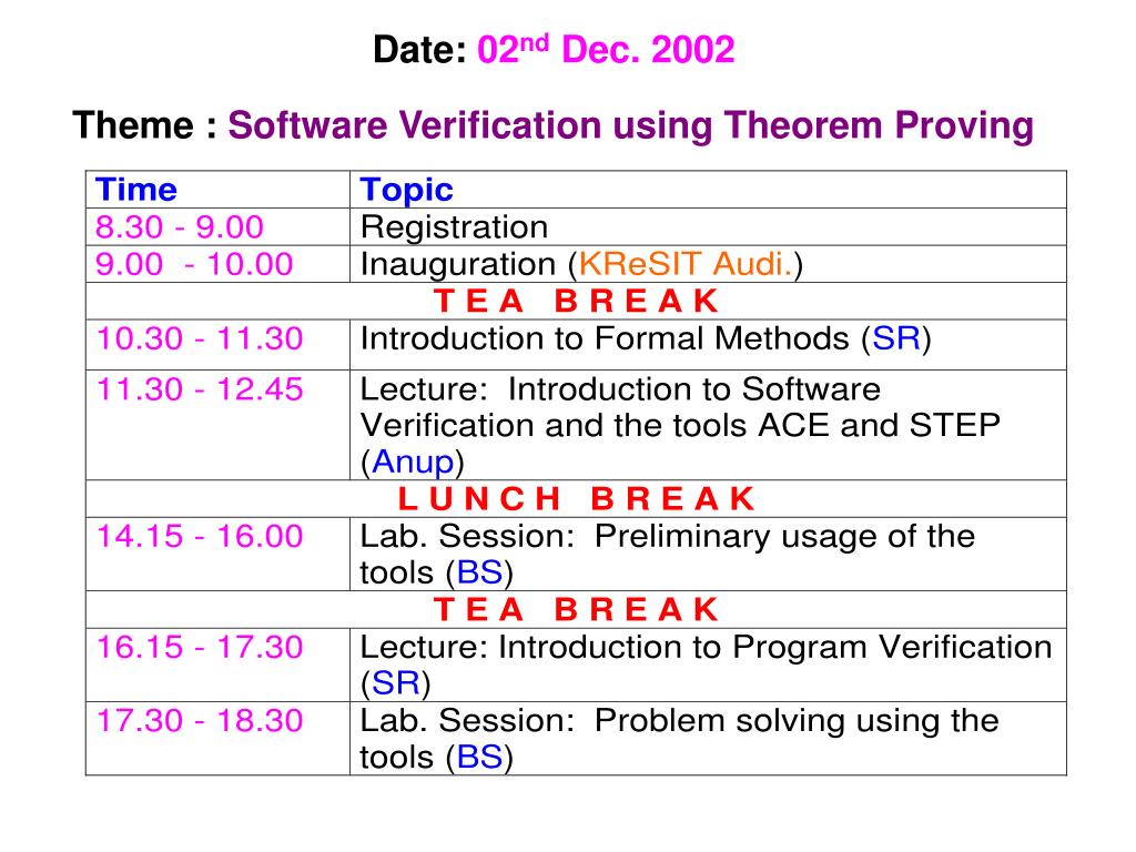 Date: 02nd Dec. 2002 Theme : Software Verification using Theorem Proving