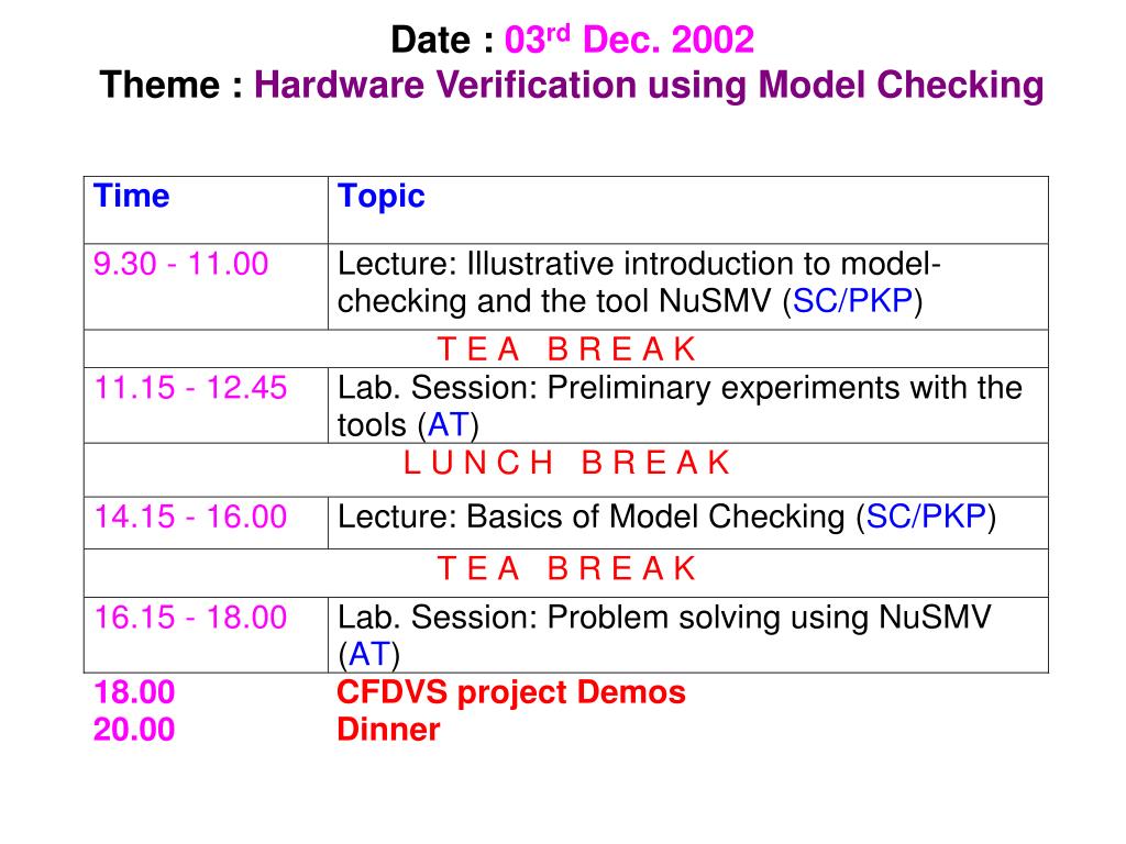 Date : 03rd Dec. 2002 Theme : Hardware Verification using Model Checking