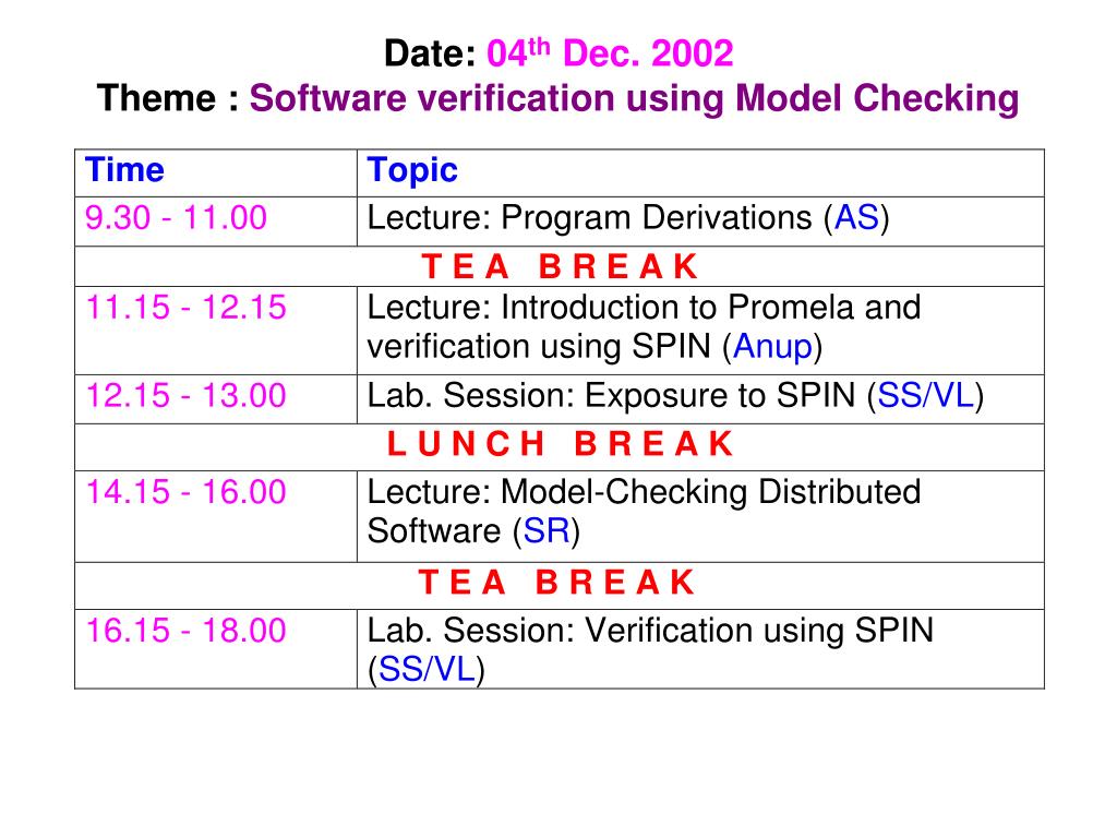 Date: 04th Dec. 2002Theme : Software verification using Model Checking