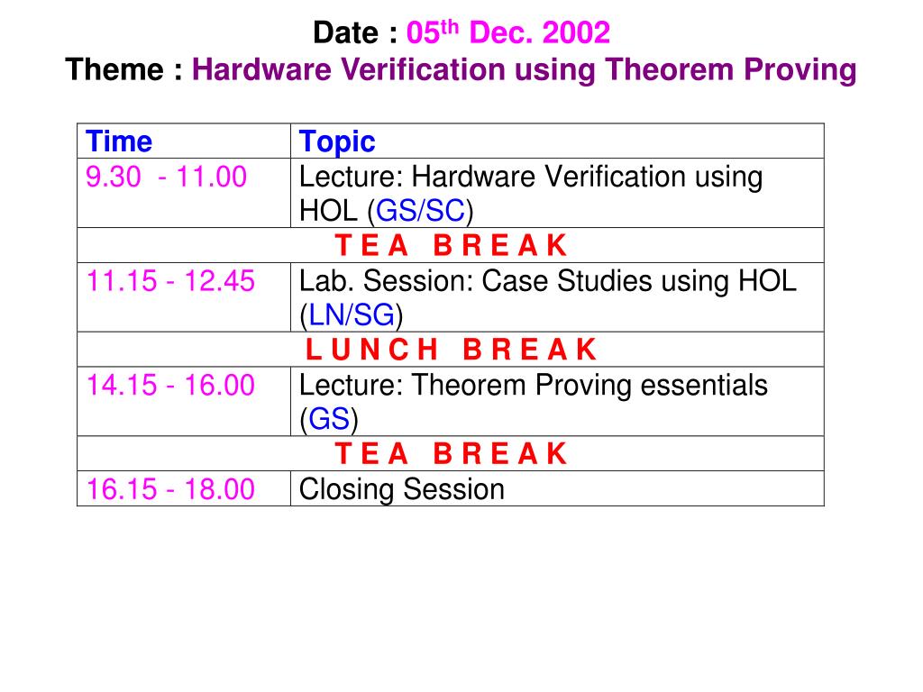 Date : 05th Dec. 2002Theme : Hardware Verification using Theorem Proving