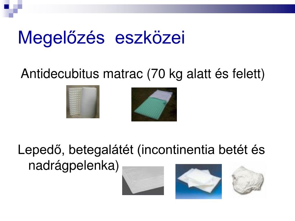 Megelőzés eszközei Antidecubitus matrac (70 kg alatt és felett) Lepedő, betegalátét (incontinentia betét és nadrágpelenka)