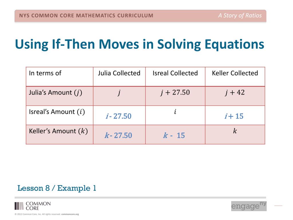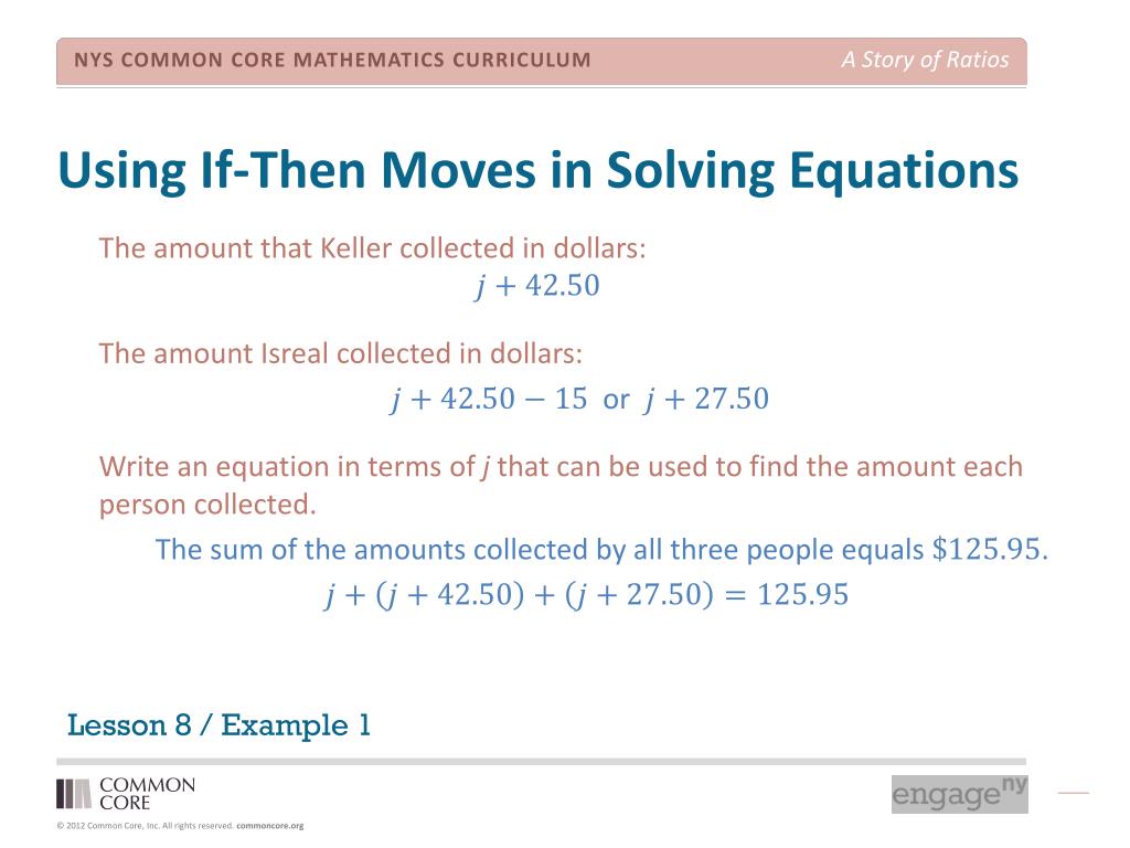 Using If-Then Moves in Solving Equations Lesson 8 / Example 1 The amount that Keller collected in dollars: The amount Isreal collected in dollars: or Write an equation in terms of j that can be used to find the amount each person collected. The sum of the amounts collected by all three people equals .