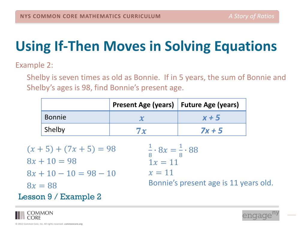 Using If-Then Moves in Solving Equations x + 5 7x + 5 Bonnie’s present age is 11 years old. Lesson 9 / Example 2 Example 2: Shelby is seven times as old as Bonnie. If in 5 years, the sum of Bonnie and Shelby’s ages is 98, find Bonnie’s present age.