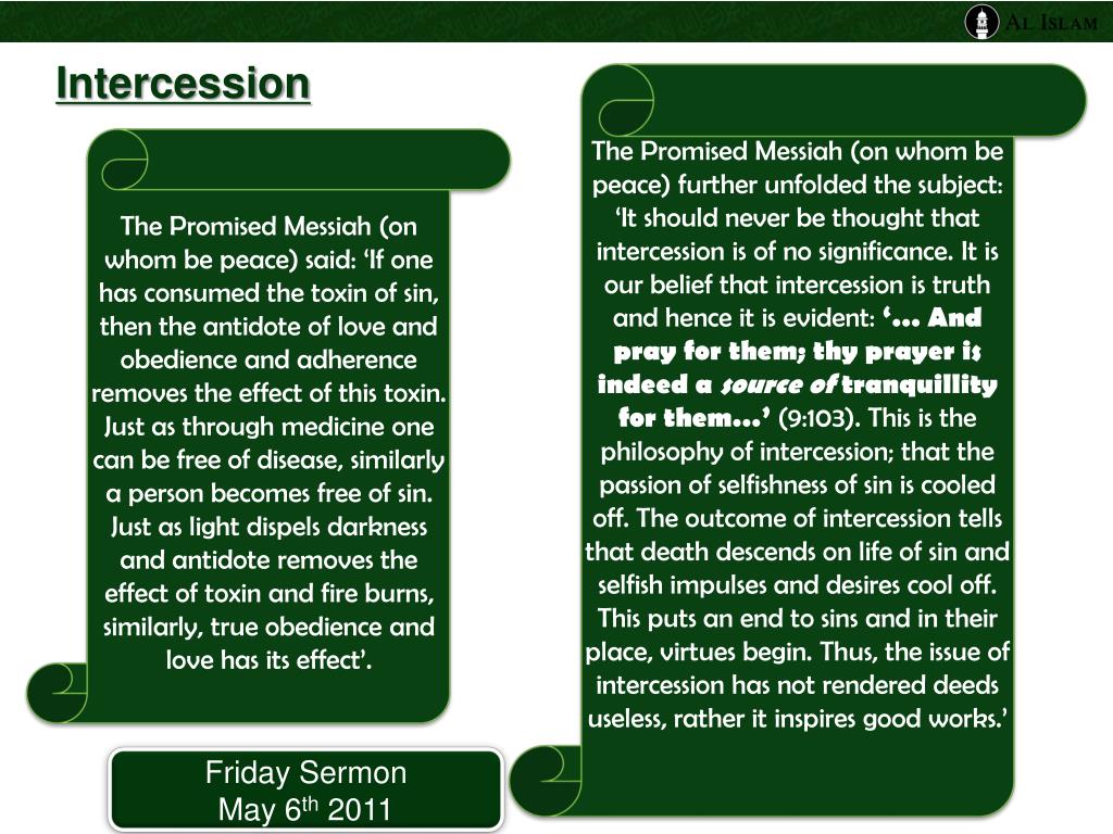 The Islamic Viewpoint of Intercession Explaining the requisites of intercession, the Promised Messiah (on whom be peace) wrote ‘Firstly, it is essential that an intercessor has a perfect connection with God, so that he can attain beneficence from God. And [he] also has an intense connection with mankind so that he can take to mankind the beneficence and the good that he attains from God. Unless both these connections are not sound, one cannot be an intercessor. The Promised Messiah (on whom be peace) also wrote that Jesus (on whom be peace) could not even reform his disciples. By contrast, through his perfect model, our Prophet (peace and blessings of Allah be on him) saved his followers from physical and spiritual chastisement and transformed their world Friday Sermon May 6th 2011