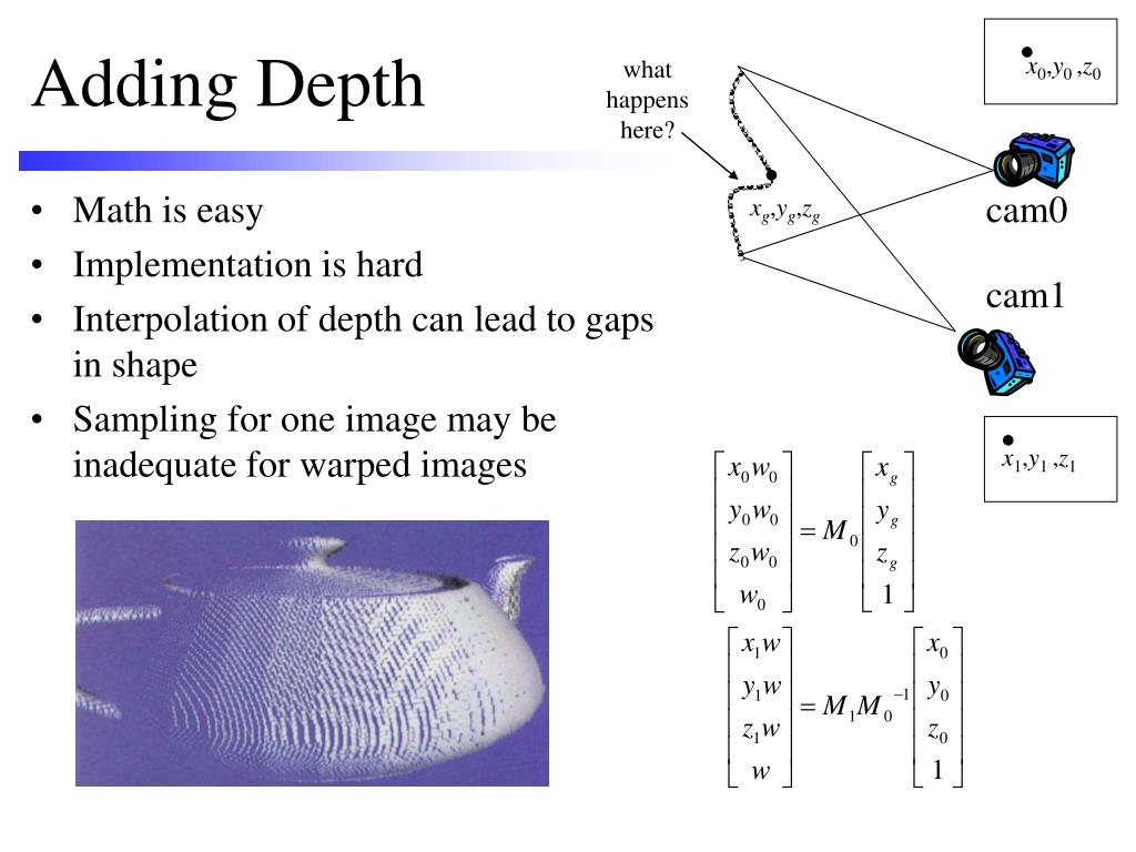 Adding Depth x0,y0 ,z0 whathappenshere? • Math is easy • Implementation is hard • Interpolation of depth can lead to gaps in shape • Sampling for one image may be inadequate for warped images cam0 xg,yg,zg cam1 x1,y1 ,z1