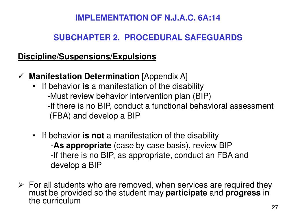 IMPLEMENTATION OF N.J.A.C. 6A:14SUBCHAPTER 2. PROCEDURAL SAFEGUARDS Discipline/Suspensions/Expulsions • Manifestation Determination [Appendix A] • If behavior is a manifestation of the disability -Must review behavior intervention plan (BIP) -If there is no BIP, conduct a functional behavioral assessment (FBA) and develop a BIP • If behavior is not a manifestation of the disability -As appropriate (case by case basis), review BIP -If there is no BIP, as appropriate, conduct an FBA and develop a BIP • For all students who are removed, when services are required they must be provided so the student may participate and progress in the curriculum