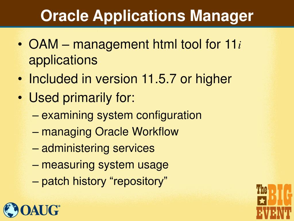 Oracle Applications Manager • OAM – management html tool for 11iapplications • Included in version 11.5.7 or higher • Used primarily for: • examining system configuration • managing Oracle Workflow • administering services • measuring system usage • patch history “repository”