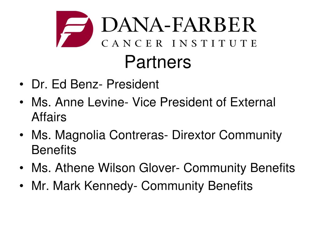 Partners • Dr. Ed Benz- President • Ms. Anne Levine- Vice President of External Affairs • Ms. Magnolia Contreras- Dirextor Community Benefits • Ms. Athene Wilson Glover- Community Benefits • Mr. Mark Kennedy- Community Benefits
