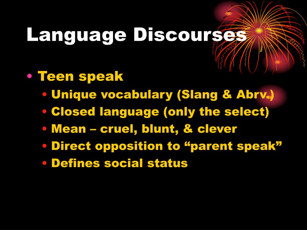 Language Discourses • Teen speak • Unique vocabulary (Slang & Abrv.) • Closed language (only the select) • Mean – cruel, blunt, & clever • Direct opposition to “parent speak” • Defines social status