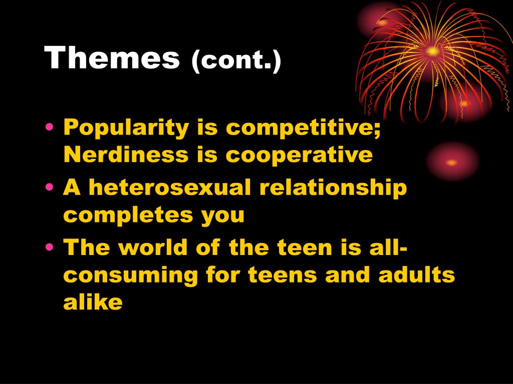 Themes (cont.) • Popularity is competitive; Nerdiness is cooperative • A heterosexual relationship completes you • The world of the teen is all-consuming for teens and adults alike