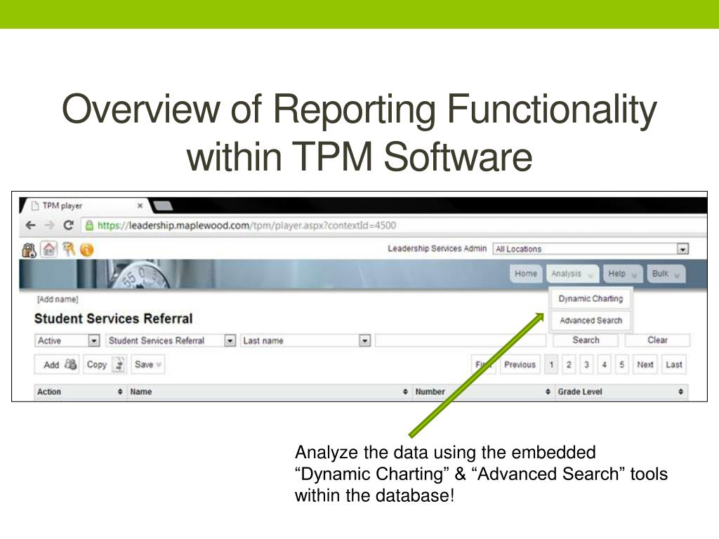 Overview of Reporting Functionality within TPM Software Analyze the data using the embedded “Dynamic Charting” & “Advanced Search” tools within the database!