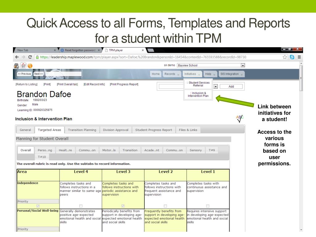 Quick Access to all Forms, Templates and Reports for a student within TPM Link between initiatives for a student! Access to the various forms is based on user permissions.