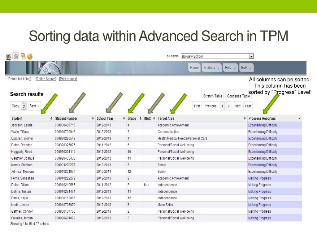 Sorting data within Advanced Search in TPM All columns can be sorted. This column has been sorted by “Progress” Level!