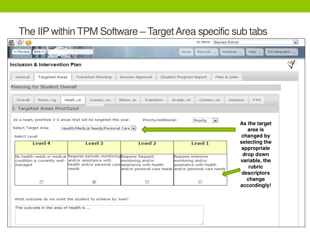 The IIP within TPM Software – Target Area specific sub tabs As the target area is changed by selecting the appropriate drop down variable, the rubric descriptors change accordingly!