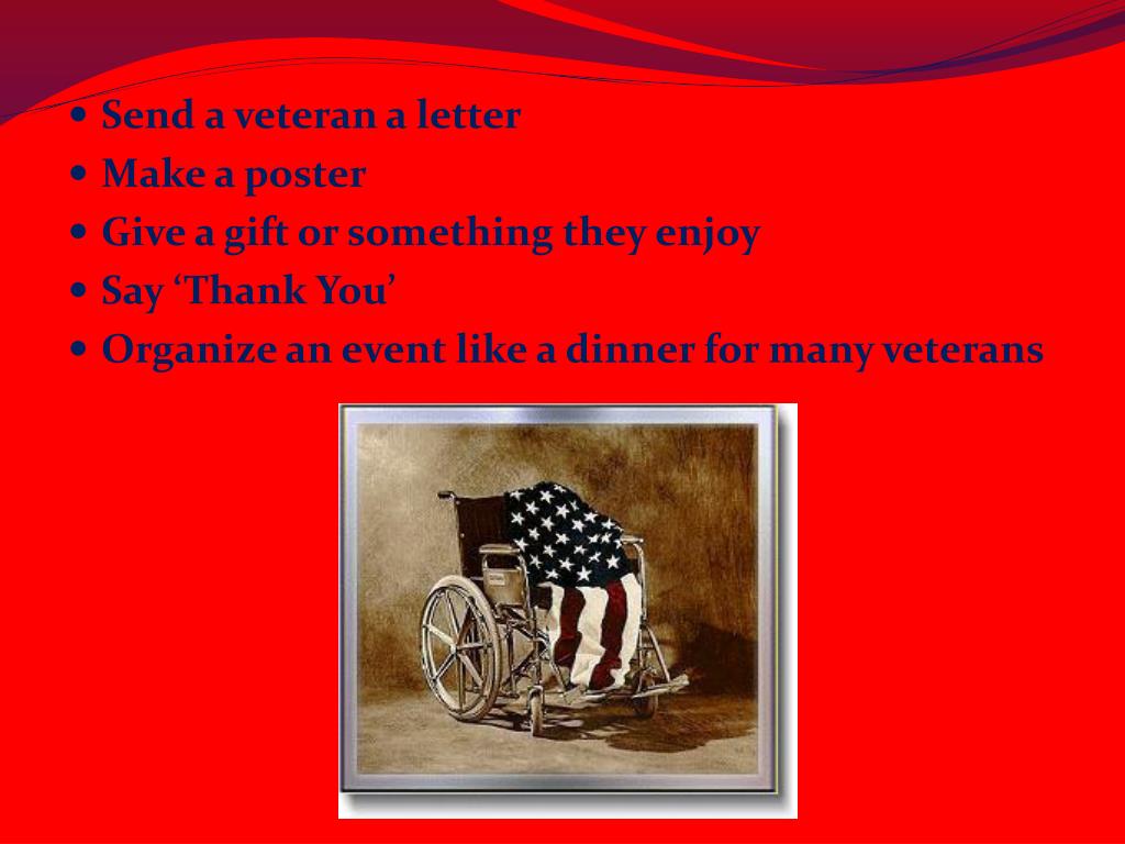 Send a veteran a letter • Make a poster • Give a gift or something they enjoy • Say ‘Thank You’ • Organize an event like a dinner for many veterans