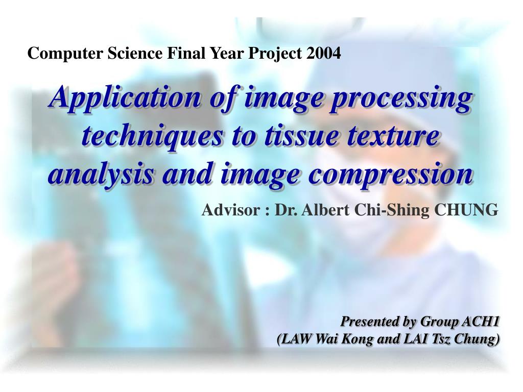 Computer Science Final Year Project 2004. Application of image processing techniques to tissue texture analysis and image compression. Advisor : Dr. Albert Chi-Shing CHUNG. Presented by Group ACH1 (LAW Wai Kong and LAI Tsz Chung). Overview. Introduction Motivation Objectives Results