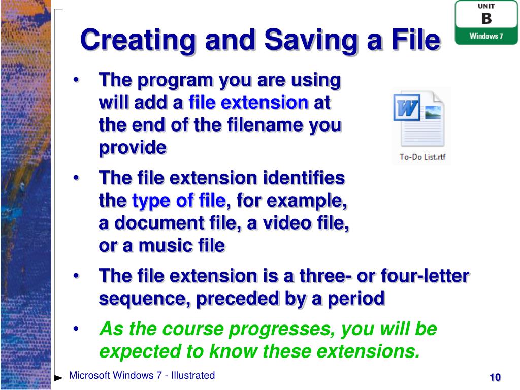 Creating and Saving a File • The program you are using will add a file extension at the end of the filename you provide • The file extension identifies the type of file, for example, a document file, a video file, or a music file • The file extension is a three- or four-letter sequence, preceded by a period • As the course progresses, you will be expected to know these extensions. Microsoft Windows 7 - Illustrated