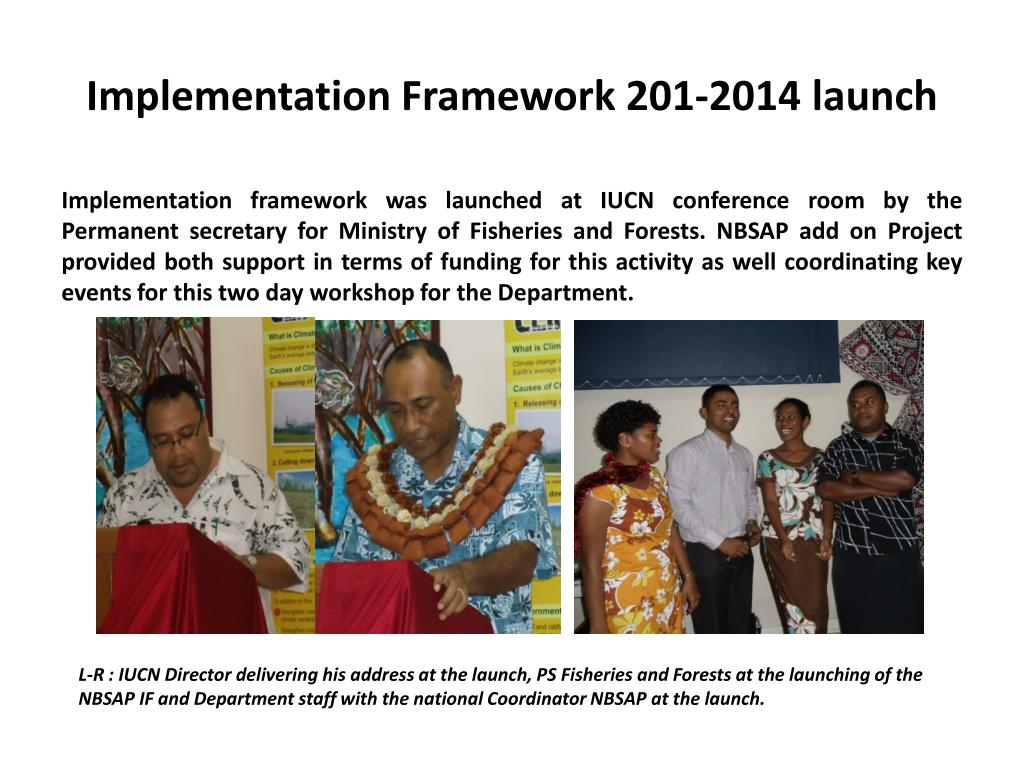 Implementation Framework 201-2014 launch Implementation framework was launched at IUCN conference room by the Permanent secretary for Ministry of Fisheries and Forests. NBSAP add on Project provided both support in terms of funding for this activity as well coordinating key events for this two day workshop for the Department. L-R : IUCN Director delivering his address at the launch, PS Fisheries and Forests at the launching of the NBSAP IF and Department staff with the national Coordinator NBSAP at the launch.