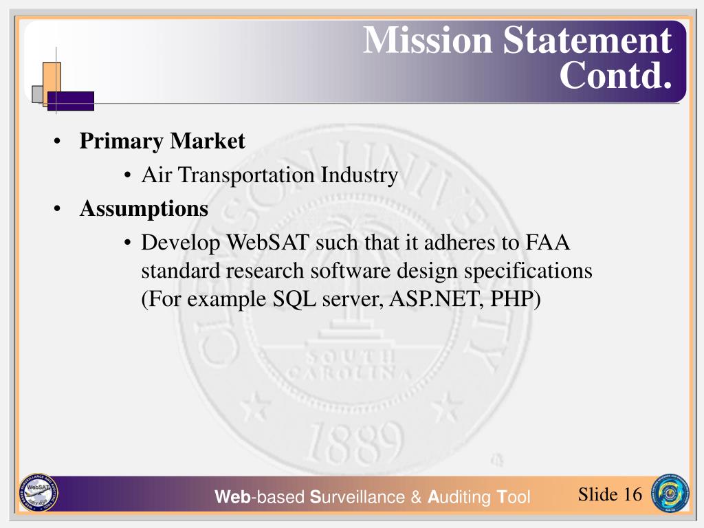 Mission Statement Contd. • Primary Market • Air Transportation Industry • Assumptions • Develop WebSAT such that it adheres to FAA standard research software design specifications (For example SQL server, ASP.NET, PHP) Slide 16