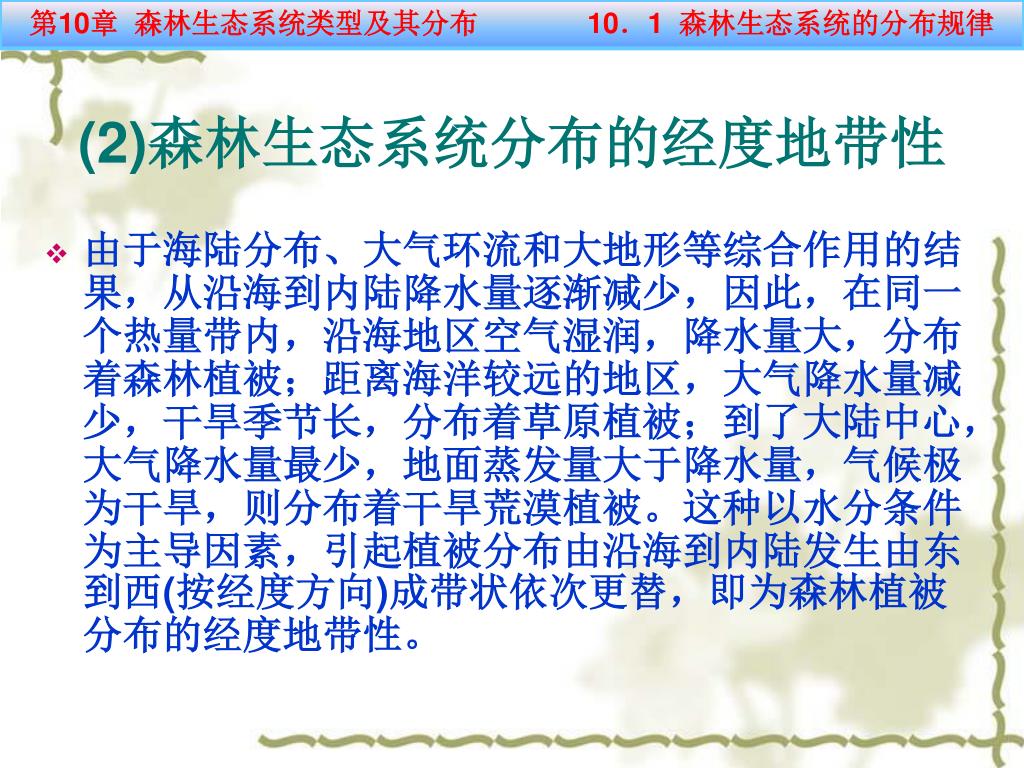 第10章 森林生态系统类型及其分布 10.1 森林生态系统的分布规律 (2)森林生态系统分布的经度地带性 • 由于海陆分布、大气环流和大地形等综合作用的结果,从沿海到内陆降水量逐渐减少,因此,在同一个热量带内,沿海地区空气湿润,降水量大,分布着森林植被;距离海洋较远的地区,大气降水量减少,干旱季节长,分布着草原植被;到了大陆中心,大气降水量最少,地面蒸发量大于降水量,气候极为干旱,则分布着干旱荒漠植被。这种以水分条件为主导因素,引起植被分布由沿海到内陆发生由东到西(按经度方向)成带状依次更替,即为森林植被分布的经度地带性。